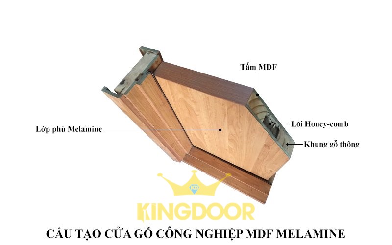 Cửa gỗ MDF Melamine được sản xuất tại Kingdoor có cấu tạo gồm khung xương là gỗ thông New Zealand đã được xử lý chống mối mọt, cong vênh. Sử dụng ván MDF lõi xanh chống ẩm, bề mặt phủ Melamine có màu sắc bắt mắt. Bên trong là giấy tổ ong, giúp cách âm cách nhiệt tốt, tăng lực kéo giúp chịu lực tốt.
