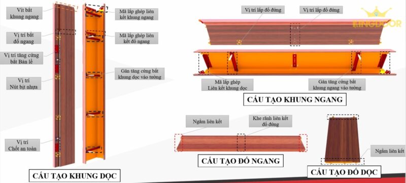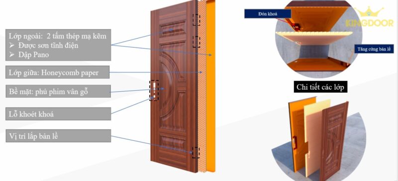 Được làm từ thép mạ điện không gỉ có độ dày 0,7 – 1mm phủ phim vân gỗ, dập lõm các biên dạng cơ bản.
